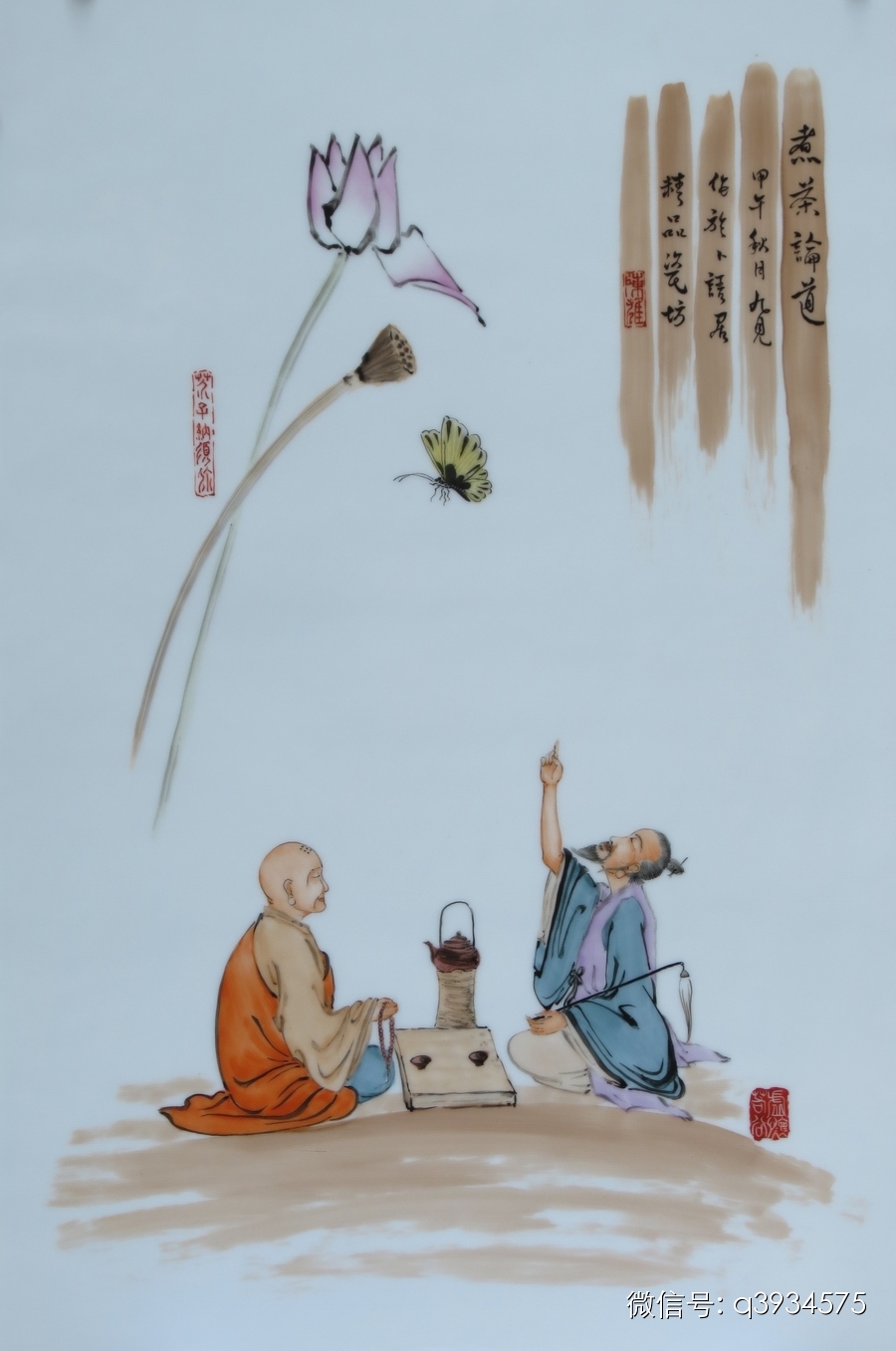 陈:请听我慢慢说来。这幅叫“煮茶论道”,只是论而没有定性,怎么认知只有仁者见仁智者见智,我只是提出一些个人认知。左边这个传红袈裟的和尚代表论证的一方,右边这穿蓝褂的道士代表另一方,双方是在煮茶中佩佩而谈,各抒己见。