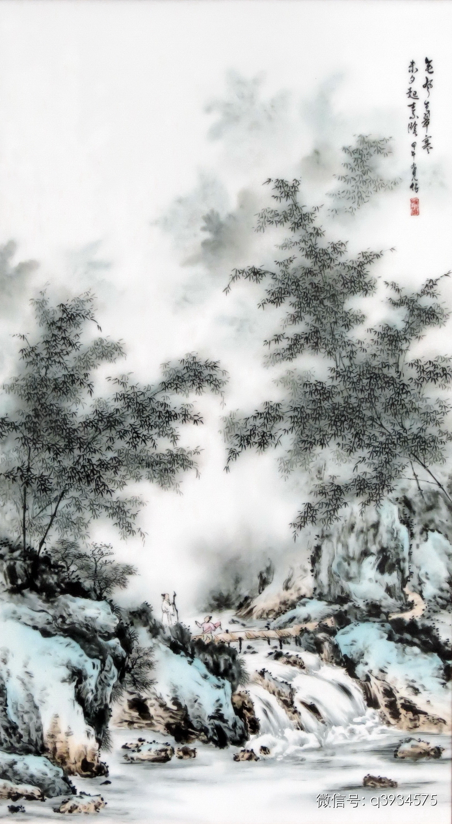 陈:我很高兴你能有这种感觉!中国画笔墨讲究在似与不似之间,这是中国画魅力所在,也是文人画追求的一种境界。你应该有去过类似的地方,这是我在读宋人杨万里的诗篇《过单竹泽径》 时突然想到我到过的一处山野竹林,从那里采集的素材中选出一些,通过提炼创作出来的,并选取了诗中后句作为题意落款,“无风生翠寒。未夕起素阴”。那次去,虽然是炎夏,但是走在山野竹林中那种感觉,真如诗中所写的那种自然形态,令人觉得已经融入自然,没有具体的思想行为,就是一种感觉,那就是前面说的“无味本身就是味”。画中点缀上一老一少,还拿上古琴,这是我加进去的含义。老少代表前后相传,古琴点出这山水的优雅,也就是说,希望这令人忘我的优雅山水能一代接一代传下去,不会受到破坏,让后来人可以感受这大自然的神韵。当然,理解画更需要看画的人发挥想象,静心去看,神游其中,才能更深的体会画者的意境!