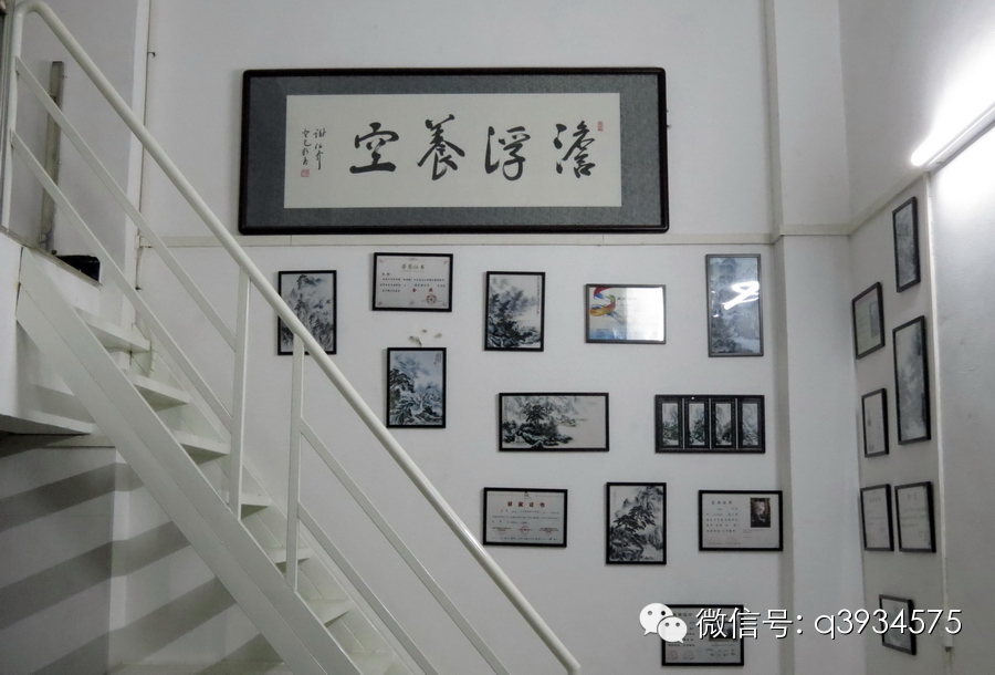 金秋送爽,编者再次走进瓷画师陈雄的工作室“卜语居精品瓷坊”,浓厚的文化氛围从面积不大的空间里散发出来,很素雅,很简约。初映眼帘的是阁楼扶梯上的一幅行楷书法作品,写着“澹浮养空”(图一),下面错落有致的作品照片墙,更是别出心裁。顺着阁楼扶梯上来到陈老师画画的房间,第一眼又看到的是另一幅书法作品,篆书“花间啸月”(图二),挂字下面的大工作台上笔墨、颜料各就其位,右边墙上挂着两幅陈老师的瓷画作品,而左边书柜中的书籍分类整齐地排放着,有序且严谨。不是说艺术家都是不修边幅吗?怎么陈老师的工作室看起来不像搞艺术的,肉眼所及的地方竟然连些许灰尘都看不到?!诸多感叹与疑问突然间在脑海跳跃,很想更深入地去了解陈老师对于艺术的看法。今天真是幸运,陈老师得空和我进行了一次心灵之旅的交谈: